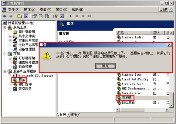 右击桌面“我的电脑”图标 - 依次点击“管理”- “服务和应用程序”-“服务”- 启动“用友通服务”时提示“本地计算机上的用友通服务启动后又停止了。一些服务自动停止,如果它们没有什么可做的,例如“性能日志和警报”服务”。