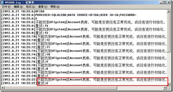 (1)查看UF2000.log提示:[2012.8.21 10:23:22]不能找到UFSystem或Account表库,可能是安装没有正常完成,或没有进行初始化,请运行行系统管理进行安装后的初始化。如下图所示: