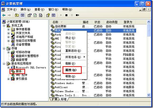 d、如果数据库服务正常启动,SA口令也是正确的,系统管理也能够正常登录,那么请对用友通服务授予LOCAL SERVICE权限,操作步骤如下:右击“我的电脑”- 选择“管理”-“服务和应用程序”-“服务”-“用友通服务”,右键“属性”,选择“属性”,如图: